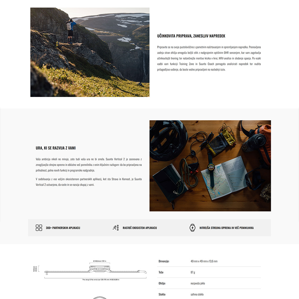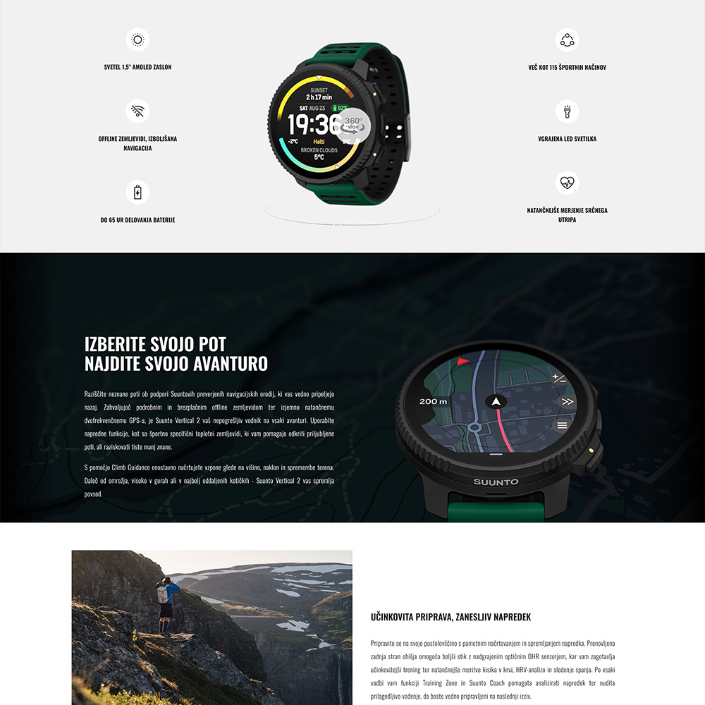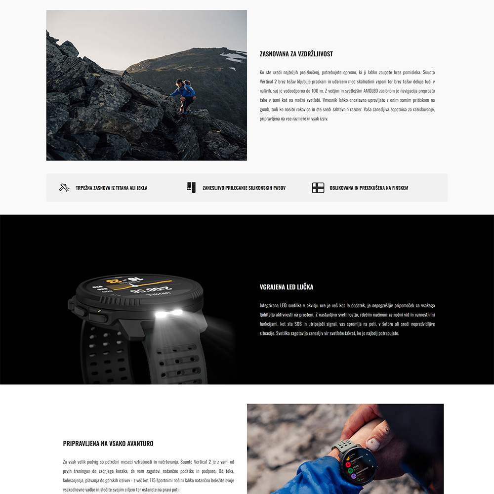Na stran smo integrirali interaktivni 360° prikaz izdelka, ki omogoča ogled ure Suunto Vertical 2 iz vseh zornih kotov.