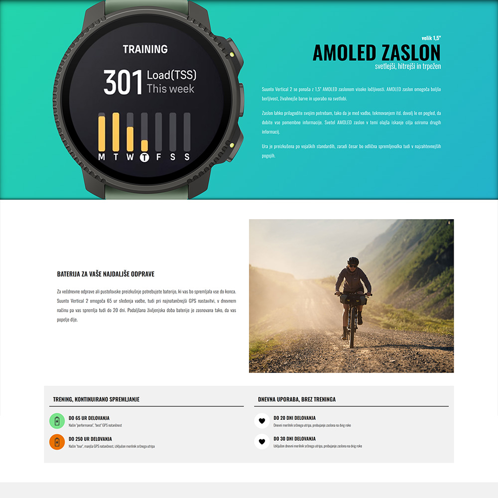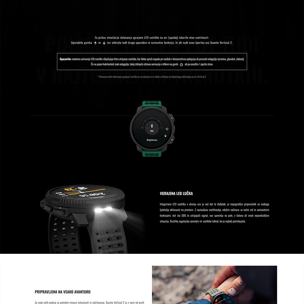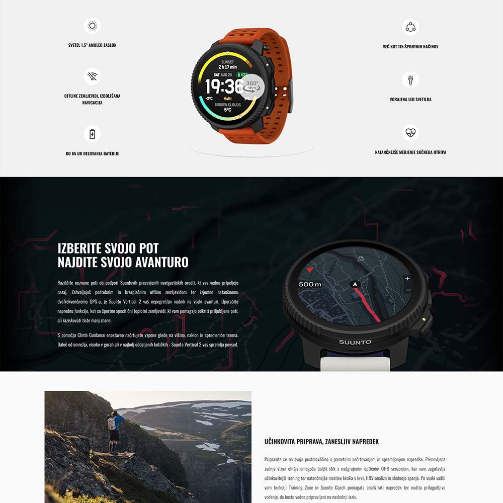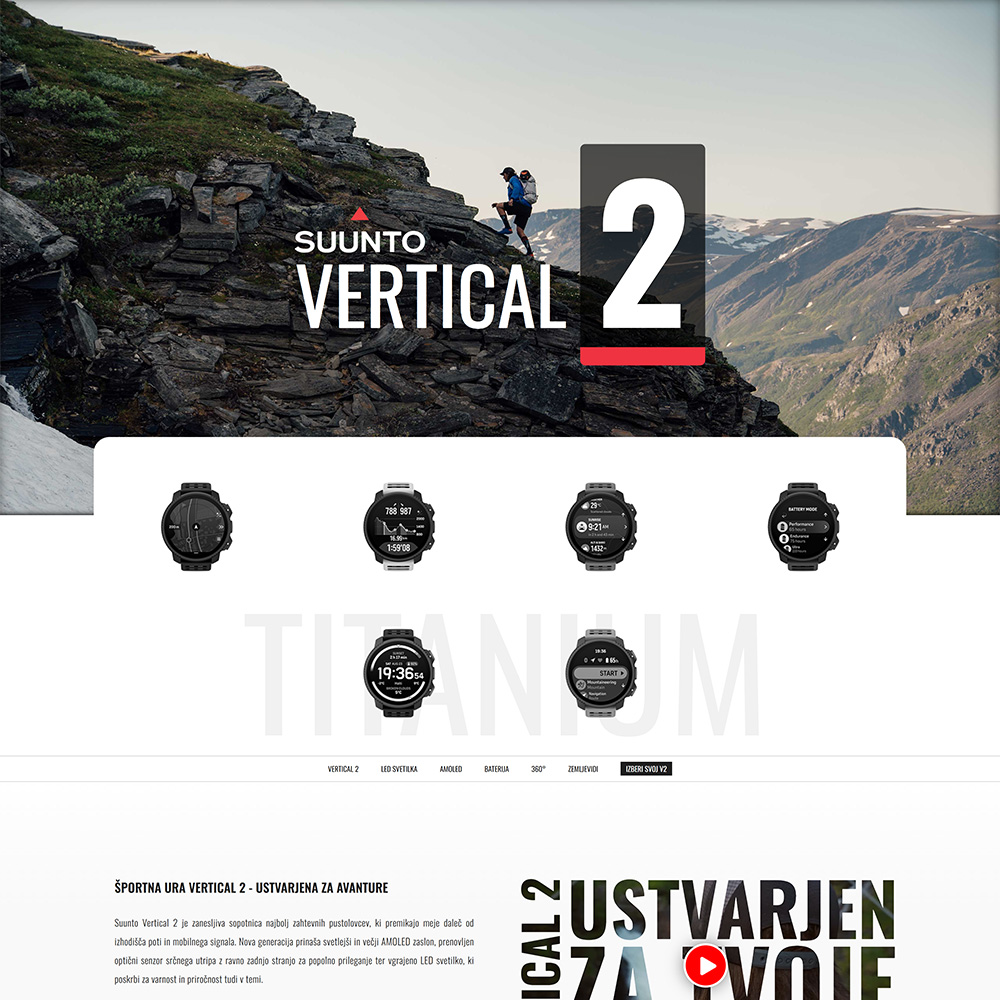Na stran smo integrirali interaktivni 360° prikaz izdelka, ki omogoča ogled ure Suunto Vertical 2 iz vseh zornih kotov.