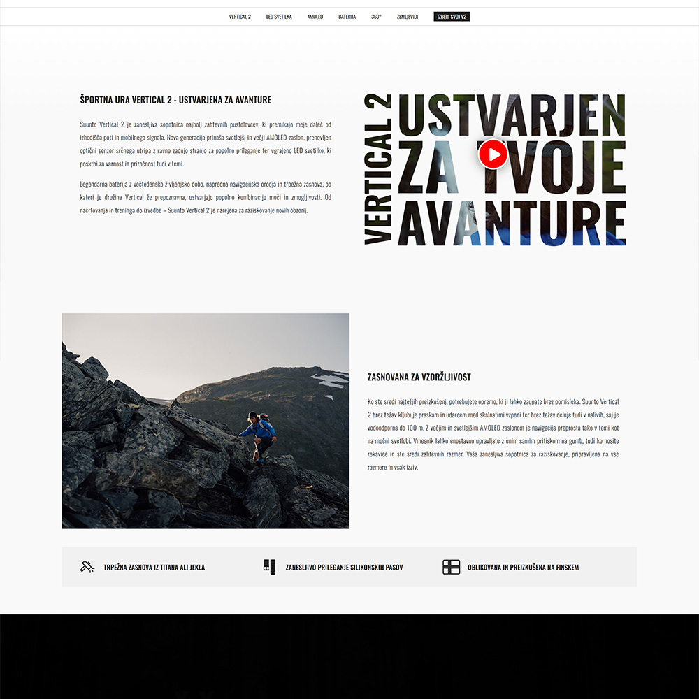 Video deluje kot dinamičen vizualni poudarek, ki uporabnika spodbuja k interakciji in ogledu vsebine v celozaslonskem načinu. Na ta način učinkovito izpostavi ključne prednosti ure Suunto Vertical 2 ter ustvari bolj poglobljeno in privlačno uporabniško izkušnjo.